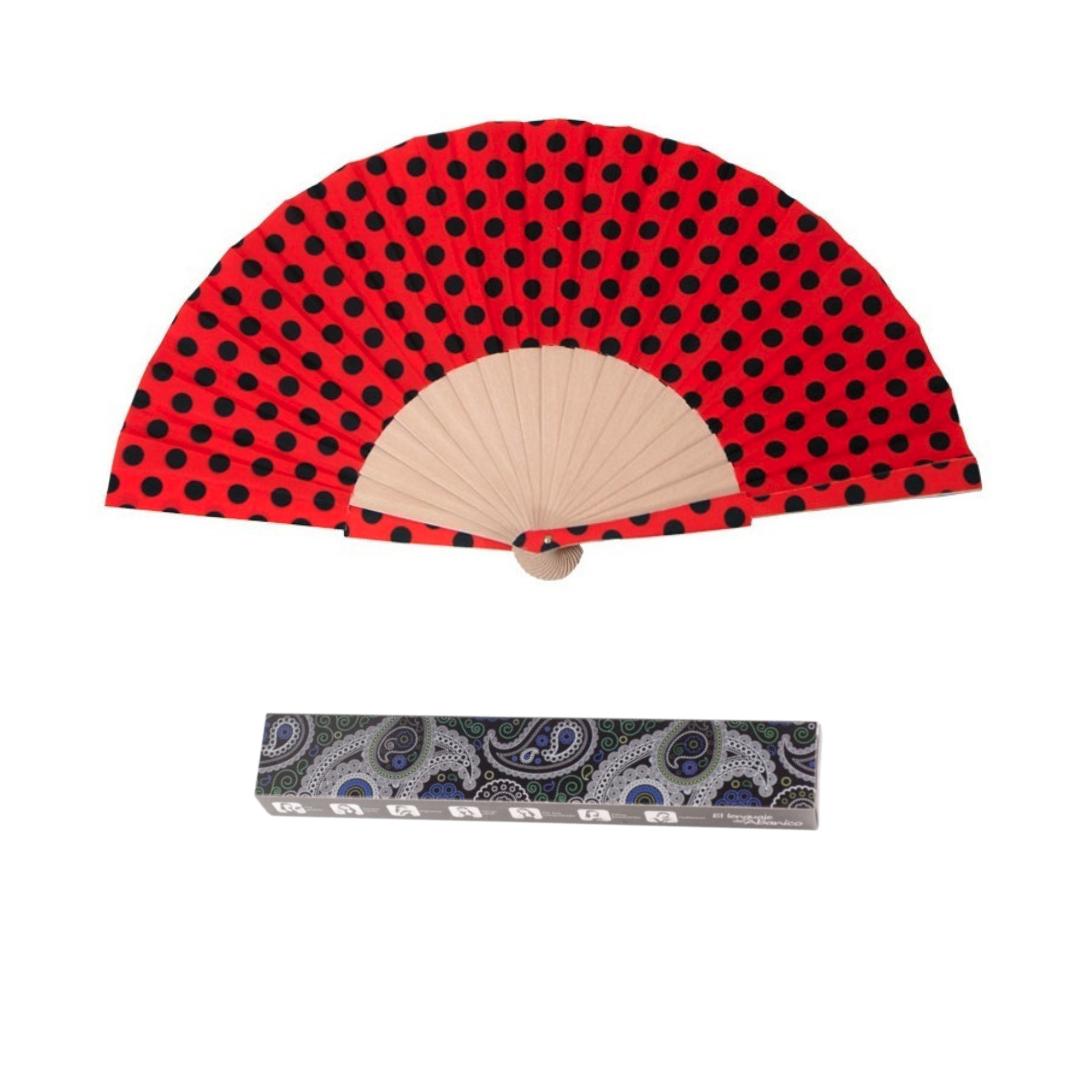 La impresión de los topos se realiza directamente en la tela y con la primera varilla revestida de tela con un diseño ideal para fiestas y eventos flamencos.