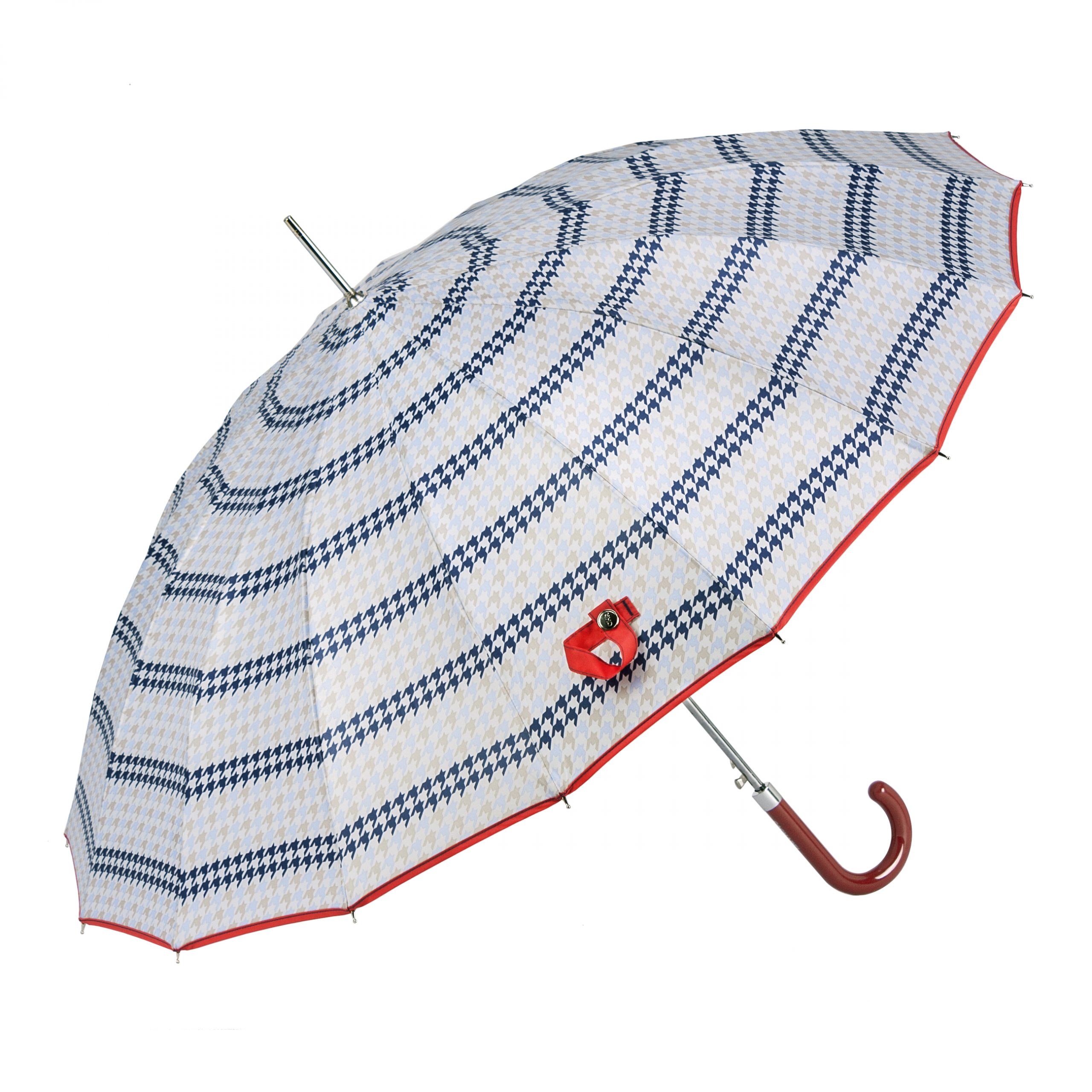 Paraguas Cacharel largo para mujer con sistema de apertura automática. Un paraguas elegante con estampado de pata de gallo, un clásico que nunca pasa de moda. El mango y el ribete de color diferente al del estampado, dan un toque especial al diseño de este bonito paraguas. Gran calidad y resistencia en este paraguas de 16 varillas antiviento y tejido extraresistente al agua.