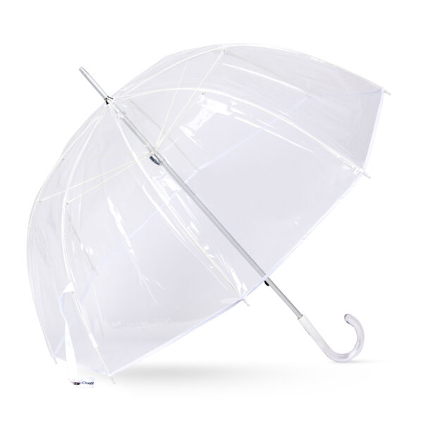 Paraguas Cacharel transparente para mujer con ribete. Un elegante paraguas largo de mujer con forma de cúpula y sistema de apertura manual . Un paraguas de calidad de la marca Cacharel con cúpula de PVC bombé y con montura resistente. Un paraguas resistente que gracias a su forma y transparencia garantiza mejor protección y visibilidad.